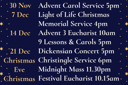 Advent and Christmas are almost upon us and we have a rich variety of events and services for you to attend. We look forward to welcoming you! Sunday 30 November Advent 1 8.30am Morning Prayer, Barlborough 10.00am Sung Eucharist, Clowne 5.00pm Advent Carol Service, Barlborough Saturday 6th December – Clowne Christmas Fair 10am-1pm Sunday 7th December Advent 2 8.30am Morning Prayer, Barlborough 10.00am Sung Eucharist, Clowne 4.00pm Light of Life Memorial Service, Barlborough Tuesday 9th December 7pm Light of Life…